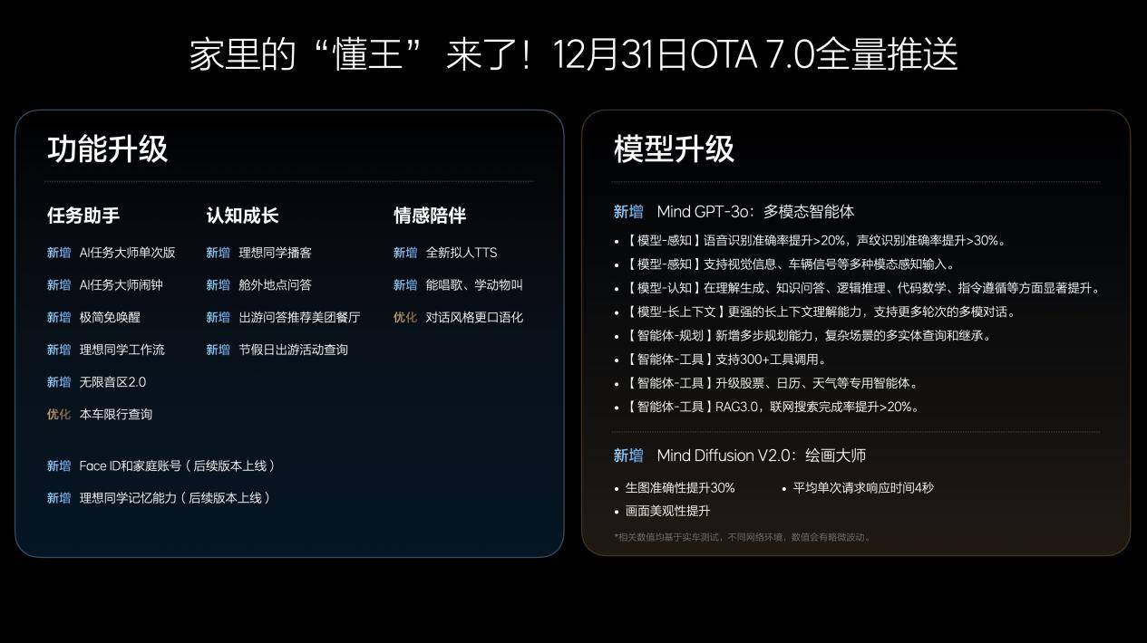 2024年12月25日-27日,理想汽車連續(xù)三天推出“2024理想 AI Talk”,分享了對(duì)人工智能的最新思考,以及包含智能駕駛和理想同學(xué)在內(nèi)的人工智能技術(shù)的最新進(jìn)展,并宣布基于自研基座大模型Mind GPT的理想同學(xué)從車機(jī)進(jìn)入手機(jī),App已于12月27日全量上線。此外,理想汽車宣布OTA 7.0版本車機(jī)系統(tǒng)將于12月底全量推送AD Max用戶,新增AI推理可視化、高速端到端等功能,并實(shí)現(xiàn)Mind GPT-3o、Mind Diffusion V2.0的能力升級(jí)。