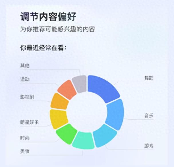 “信息繭房”自我評估功能是指根據用戶的推薦頁視頻的內容類型、內容偏好、推薦強度分布,以可視化形式呈現。