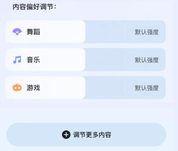 滑動對應興趣標簽,用戶可以依據個人喜好自主調整推薦頁內容推送強度。同時,可點擊“調節更多內容”按鈕,選擇更多元的標簽。