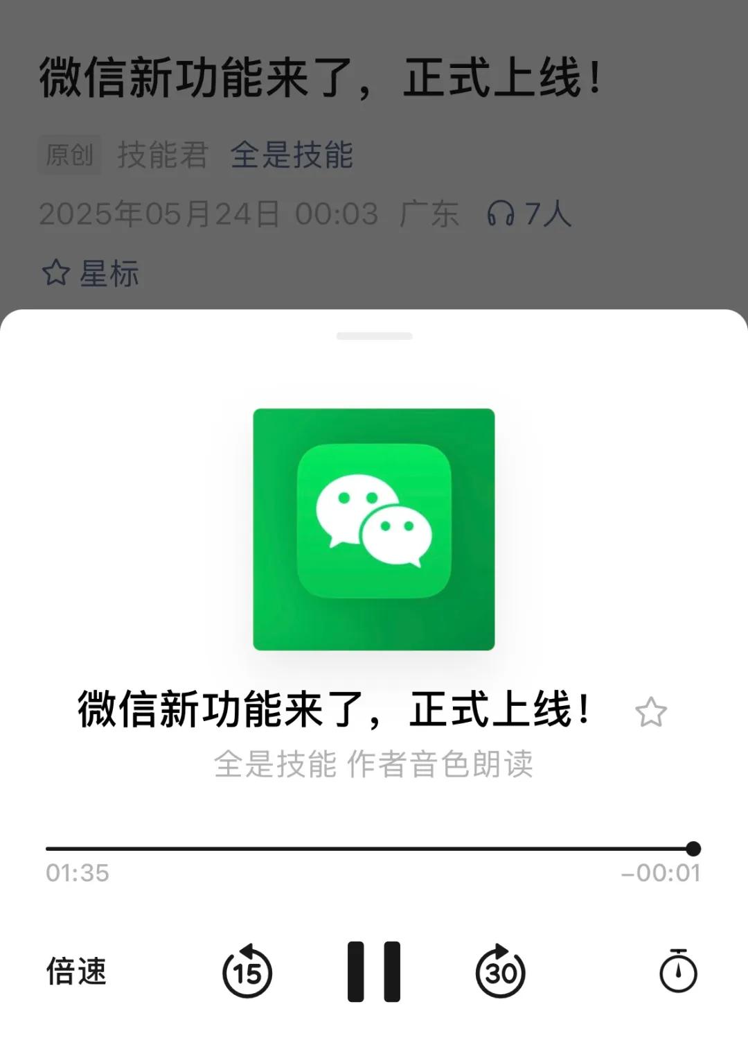 現在在文章標題下方,點擊“聽全文”后,彈出的音頻播放界面,比以前精簡許多。