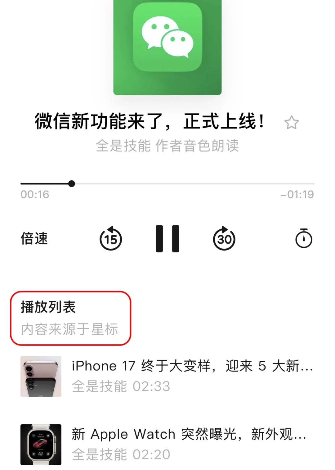 此外,凡是被你星標的文章,都會被自動列入待播列表。在播完當前音頻后,便自動播放星標文章。