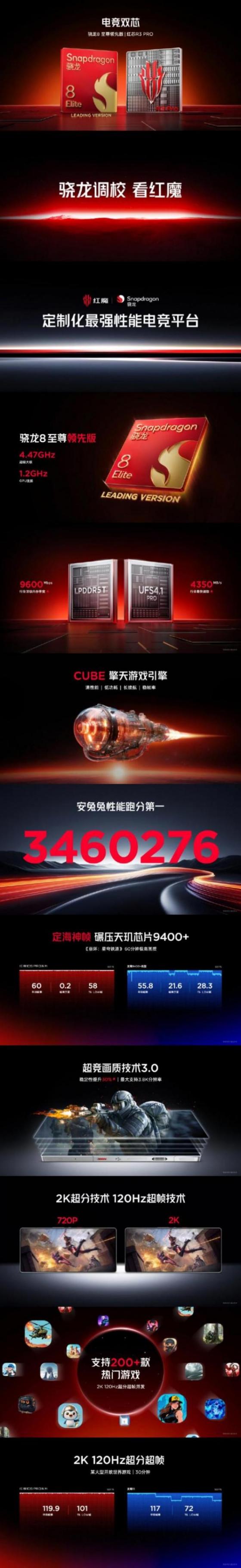 紅魔 10S Pro 系列手機搭載驍龍8至尊領先版+紅芯R3 PRO自研芯片,CUBE擎天游戲引擎,支持超競畫質技術3.0、200款+熱門游戲 2K 120Hz 超分超幀并發。