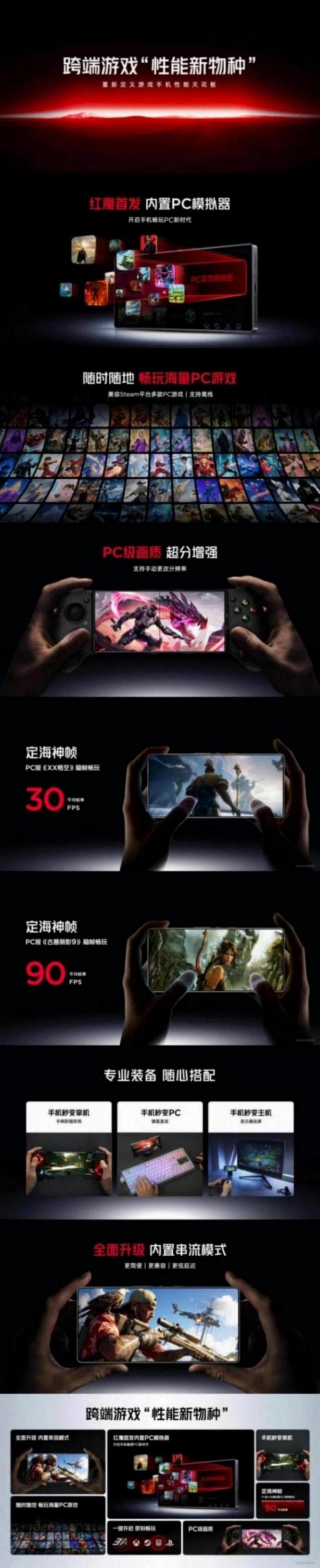 紅魔 10S Pro 系列首發內置PC模擬器,隨時隨地暢玩海量PC游戲。官方宣傳《X悟空》平均幀率30FPS、《古墓麗影9》平均幀率90FPS。