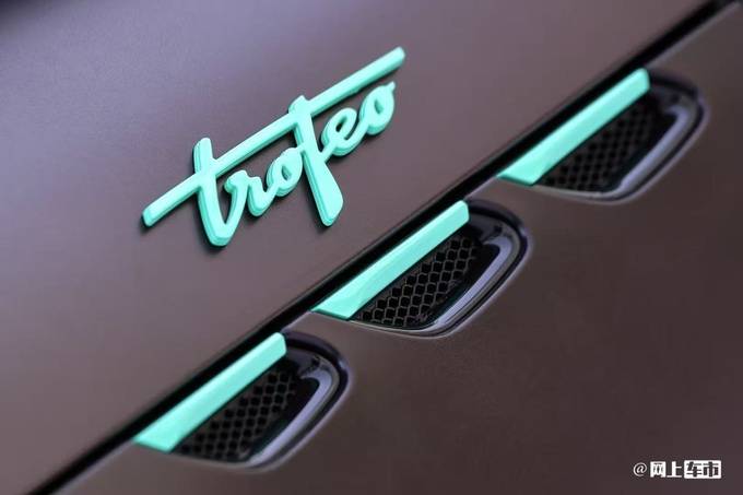 這臺車的顏色很特別,由4層漆水調(diào)和而成,官方叫彗星黑。除此之外,在外觀方面它跟Trofeo版本最明顯的區(qū)別是:帶專屬圓環(huán)的前20/后21英寸鍛造磨砂黑輪輞、帶75周年標識的輪轂蓋、車身C柱上的黑色三叉戟車標和專屬色側(cè)通風口裝飾。