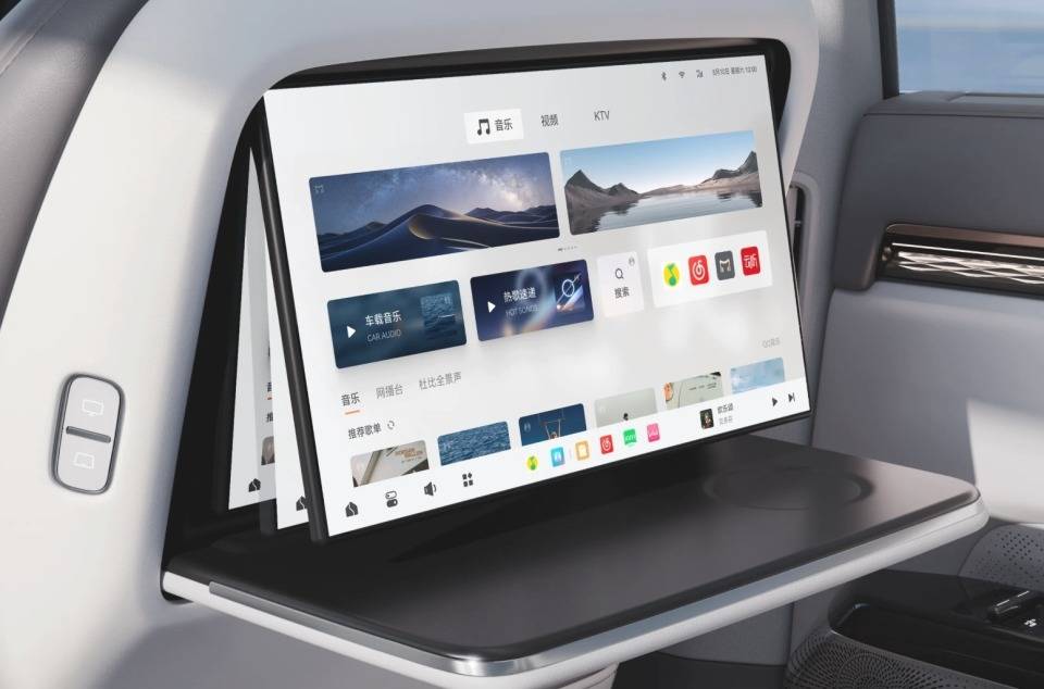 小鵬G7前后排座椅都標配了吸入式通風、加熱、按摩,并且后排座椅還標配了小桌板以及靠背電調,后排小桌板不僅左右都有,甚至還有無級懸停的支撐板,放平板放手機都不成問題,后排出風口上方還有一塊8英寸娛樂屏,上可以看平板手機,下能玩娛樂屏,簡直是帶娃神器,后排扶手還提供了一個50W無線充,沒電快充也完全沒問題。