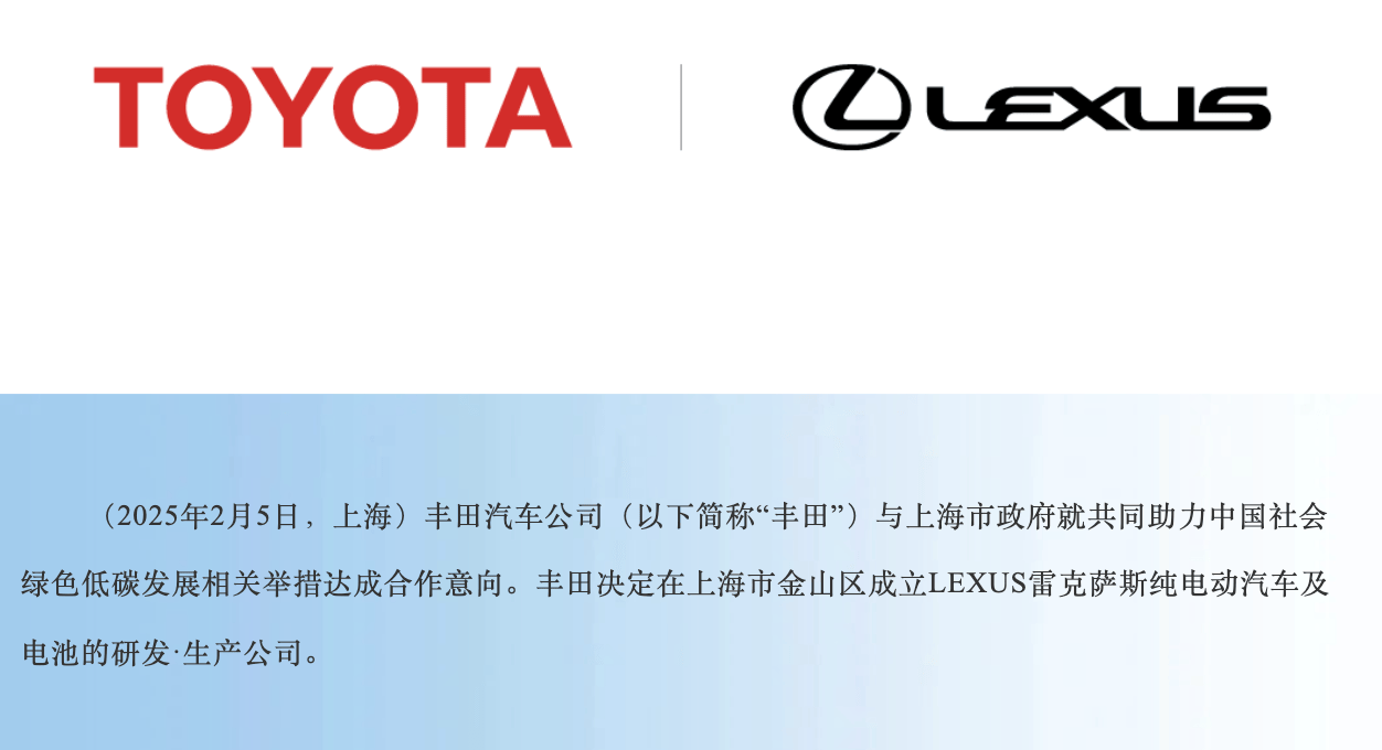 事件:2月5日,豐田宣布將在上海市金山區成立LEXUS雷克薩斯純電動汽車及電池的研發和生產公司。這是豐田在中國的首個獨資工廠,也是雷克薩斯品牌在中國的首個生產基地。新工廠計劃于2026年正式投產,主要生產雷克薩斯混動車型及純電動車型,預計年產能將達到10萬輛。