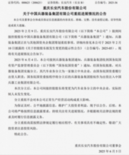 事件:6月5日,重慶長安汽車股份有限公司(長安汽車)正式發布公告,稱接到間接控股股東中國兵器裝備集團有限公司(簡稱“兵裝集團”)通知:經國務院批準,兵裝集團實施分立,其汽車業務分立為一家獨立中央企業,由國務院國資委履行出資人職責。