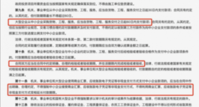 條例中明確規定,“大型企業從中小企業采購貨物、工程、服務,應當自貨物、工程、服務交付之日起60日內支付款項”。另外,還有“不得強制中小企業接受商業匯票、應收賬款電子憑證等非現金支付方式,不得利用商業匯票、應收賬款電子憑證等非現金支付方式變相延長付款期限”。
