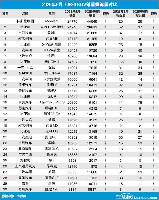 據(jù)乘聯(lián)會(huì)提供的全國(guó)汽車產(chǎn)銷數(shù)據(jù)顯示,2025年6月國(guó)內(nèi)SUV市場(chǎng)累計(jì)零售銷量104萬輛,環(huán)比上漲7.3%,同比上漲16.3%。同期,車質(zhì)網(wǎng)受理車主針對(duì)SUV的有效投訴5,702宗,環(huán)比微降1.1%,同比上漲41.8%。去除投訴人自愿申請(qǐng)撤訴的信息后,2025年6月TOP30 SUV銷量投訴量排名如下:
