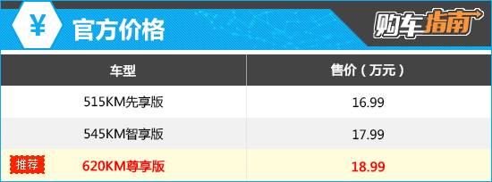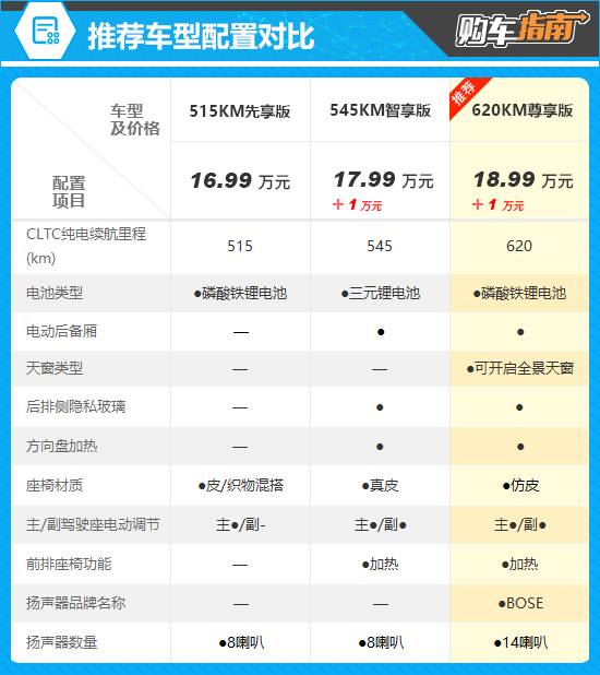 頂配620KM尊享版是本次的推薦車型。通過配置對比可以看出,推薦車型相比中配車型,CLTC純電續航里程提升至620km,基本告別了里程焦慮。國人喜愛的可開啟全景天窗也沒有缺席,擁有更好的透光性。此外,推薦車型還獨占14喇叭BOSE揚聲器,用車體驗得到再次提升。售價僅比中配車型多10000元,并且一口價僅為16.99萬元,絕對物超所值。