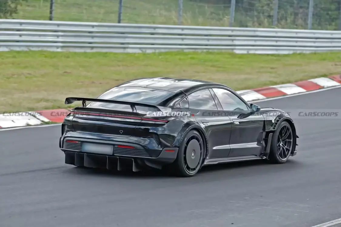 據(jù)悉,該原型車由賽車手 Lars Kern 駕駛,其外觀基于 Taycan Turbo GT 打造,但細(xì)節(jié)卻有諸多不同之處。從諜照中可以看到,該車配備了經(jīng)過修改的進(jìn)氣口以及被遮蓋的空氣簾,同時(shí)車身上還增加了鴨翼和加寬的輪拱,這些設(shè)計(jì)暗示著車輛可能配備了寬體套件。進(jìn)一步觀察發(fā)現(xiàn),該車前翼子板上方有頂部通風(fēng)口,此外還有許多元素借鑒了 911 GT3 RS 上的 Manthey 套件,包括后輪的空氣導(dǎo)流盤以及前輪后方的“懸浮式”空氣動力學(xué)部件,再加上巨大的擴(kuò)散器和看似經(jīng)過輕微修改的尾翼,這些都表明保時(shí)捷正在研發(fā)一款結(jié)合了魏斯阿赫套件和全新 Manthey 套件元素的硬核車型,這或許將是迄今為止最極致、最專注于賽道的 Taycan。