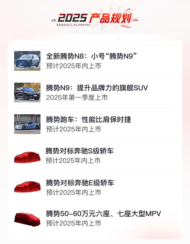 比如騰勢,準備未來兩年,布局N、D、Z、E、A 五大系列9款車型。2025年,騰勢將有新款N8、N9、跑車以及MPV等6款新車型陸續上市。在2025到2026年,騰勢將推出5大系列車型9款車型,包括兩款MPV、三款SUV、和四款轎車。