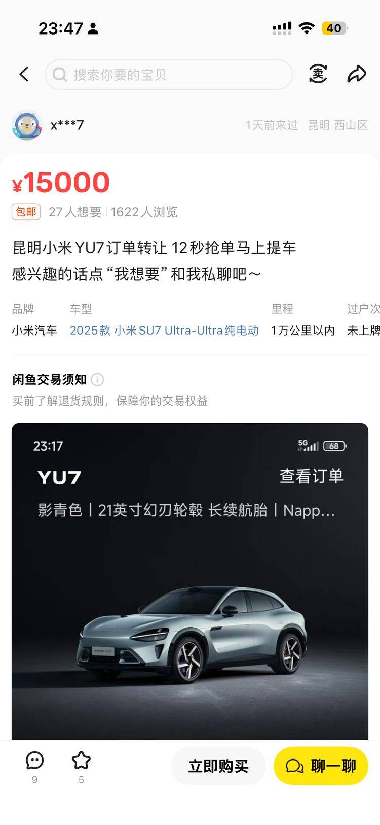 但汽車作為大宗消費品,本該有更高的套利門檻,為何也陷入“秒變二手”的怪圈?核心原因在于小米的“饑餓營銷”與產能爬坡的矛盾。知情人士透露,YU7的寧波工廠目前月產能約8000輛,而訂單量已突破35萬輛,供需缺口讓黃牛有了可乘之機。更關鍵的是,汽車產權轉移成本極低——只要完成交強險投保,就能過戶,整個流程比二手房交易簡單10倍,這為“快進快出”提供了便利。車企并非毫無察覺。小米汽車在購車協議中寫明“禁止轉賣訂單”,但缺乏強制執行手段;有經銷商嘗試對短期內過戶的車輛收回終身免費充電權益,卻被用戶以“物權自由”為由投訴到12315。這種監管空白,讓黃牛愈發猖獗:某二手車商曬出“戰績”,7月上旬已轉手12輛YU7,凈利潤超40萬元。政策紅線將至:6個月禁轉令能否終結亂象?7月19日,汽車縱橫公眾號的一則消息引發震動:工信部擬出臺新規,要求“新車登記后6個月內禁止轉讓”。這意味著,從2026年起,首批YU7車主想轉手,必須等到提車半年后,屆時新車交付周期可能已縮短,溢價空間將大幅縮水。政策背后是行業的集體反思。中國汽車流通協會數據顯示,2024年新能源汽車“準新車”轉讓量同比激增210%,其中30%的交易發生在提車1個月內。這種“擊鼓傳花”式的交易,不僅擾亂價格體系,還可能引發糾紛——北京一位車主買到二手YU7后,發現車輛綁定了原車主的小米賬號,車機系統無法激活,而黃牛早已拉黑了他的電話。