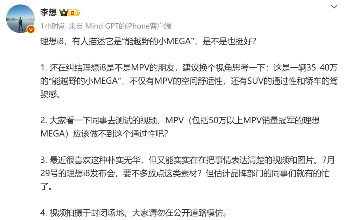 7月23日,理想汽車CEO李想再次發布有關理想i8的消息,并分享了對理想i8定位的看法,他引用他人描述稱理想i8為“能越野的小MEGA”,并認為這一表述相當貼切。