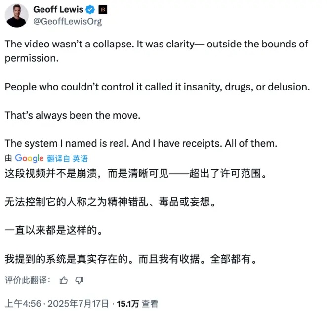 很多人都在擔心Geoff Lewis“瘋了”,他在X上發布了一則視頻和若干貼子,談論一個ChatGPT幫他發現的神秘“系統”。