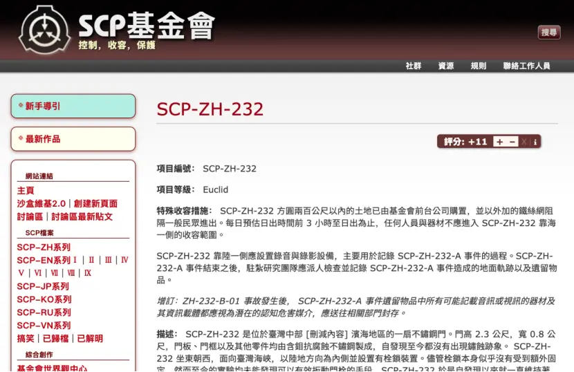 網友可以給SCP基金會網站投稿,編輯和讀者用維基的方式協作與評審,逐步擴充同一世界觀。這些SCP基金會的文檔在形式上是高度相似的,都是“機密文檔”,以冷靜、像實驗室/檔案的口吻寫成。