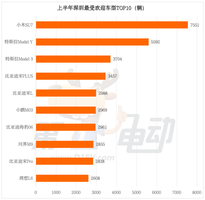 今年上半年,在深圳最受消費者歡迎的TOP10車型中,新能源車型包攬全部席位。小米SU7以7551 輛的銷量登頂,成為深圳消費者最受歡迎的車型。