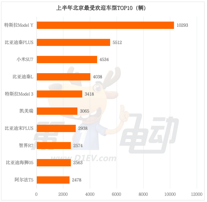 在北京上半年最受消費者歡迎的TOP10車型中,新能源車型占據(jù)了絕對主導(dǎo)地位,僅有一款傳統(tǒng)燃油車凱美瑞入圍。特斯拉 Model Y 以 10293 輛的銷量拔得頭籌,成為北京消費者的首選車型。
