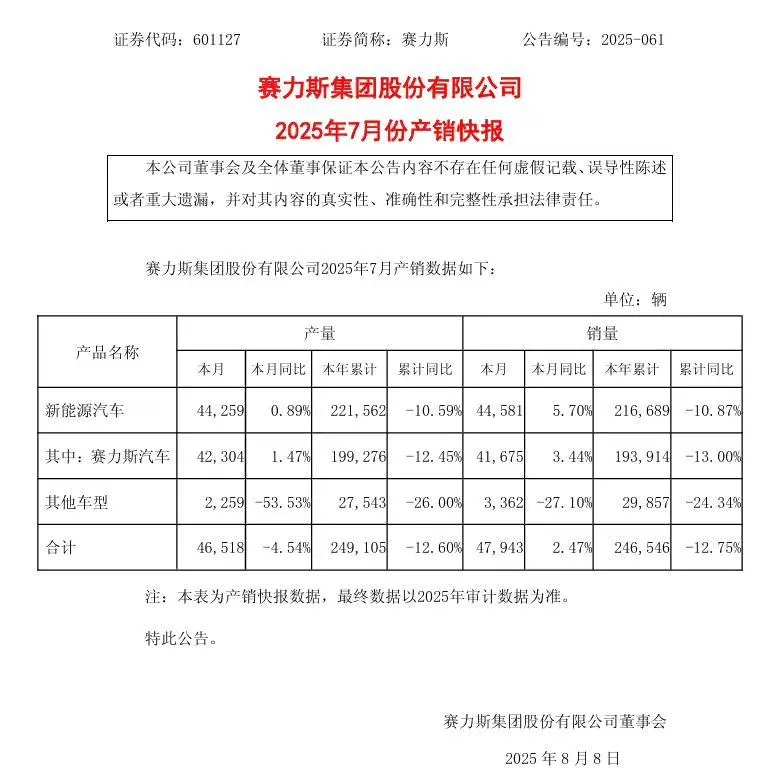 8 月 7 日消息,賽力斯今日公告稱,2025 年 7 月新能源汽車銷量為 44581 輛,同比增長 5.70%;1-6 月累計銷量為 216689 輛,同比下降 10.87%。