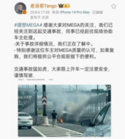事故發(fā)生后數(shù)小時,理想汽車高管湯靖通過個人微博作出官方回應(yīng):“感謝大家對MEGA的關(guān)注,我們已經(jīng)關(guān)注到這起交通事故,同事已經(jīng)趕往現(xiàn)場協(xié)助車主處理。”