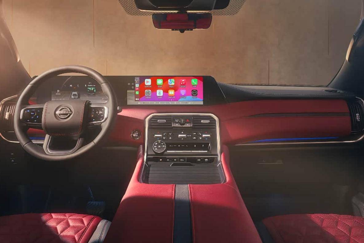 進入車內,全新途樂整體的設計更加現代化,而黑紅顏色搭配也營造了一些運動氣息。此外,新車將標配雙12.3英寸聯屏設計,內置NissanConnect 2.0智能座艙系統,而中高配車型則會升級為雙14.3英寸聯屏以及HUD抬頭顯示的組合。