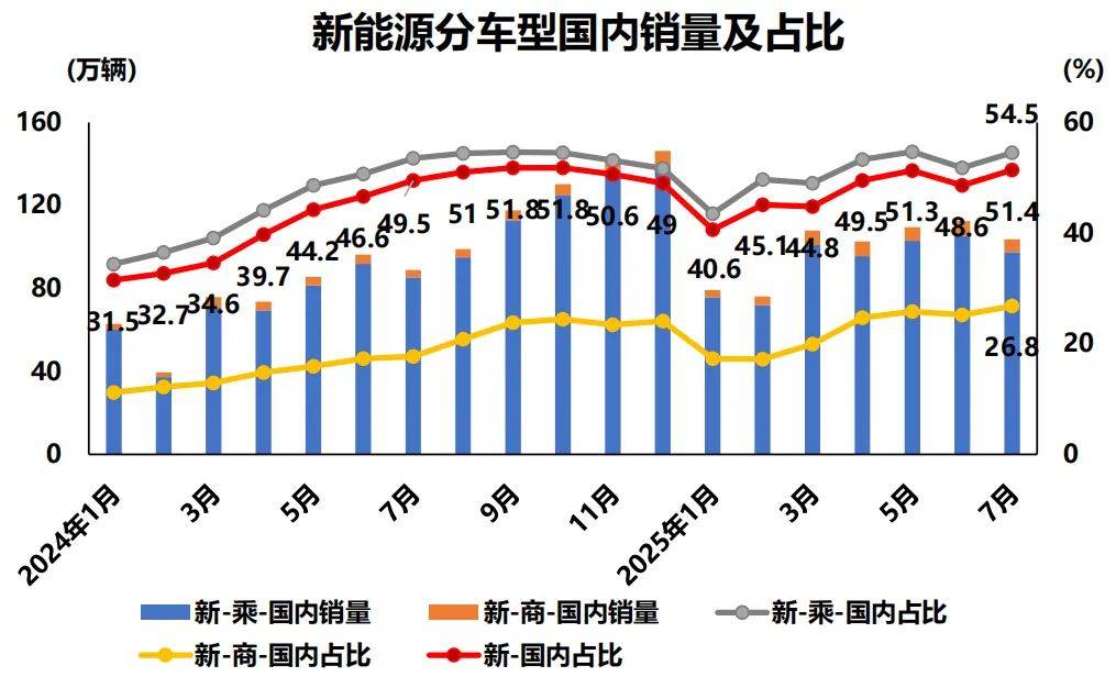 7月,新能源汽車新車銷量達到汽車新車總銷量的48.7%,其中新能源汽車國內銷量占比達到51.4%。這是去年12月新能源汽車國內銷量占比跌破50%以來,首次重回50%以上的高位。