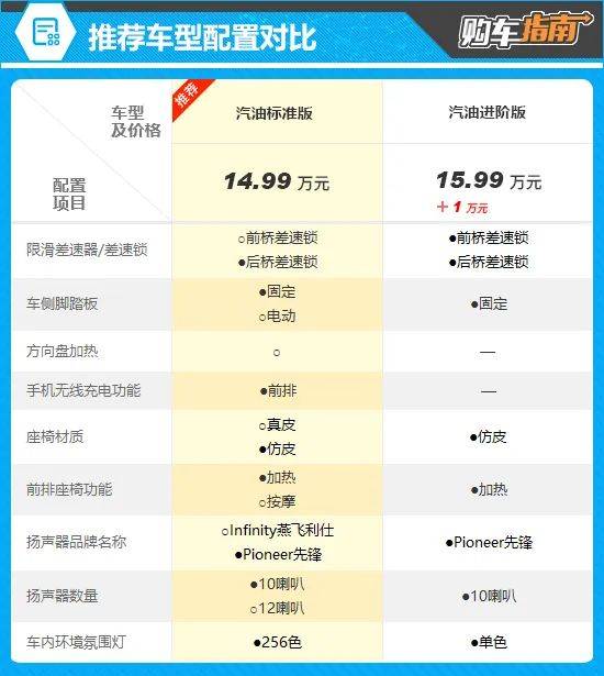 相比于高一級別的車型,推薦車型主要的差距在于沒有標配前橋差速鎖,其他配置兩者相差不大。不過,推薦車型的優勢在于提供了眾多配置的選裝機會,比如,可選裝前橋差速鎖,擁有與高一級別車型同樣出色的脫困能力;另外,還可選裝舒享包,包含電動車側腳踏板、真皮材質座椅、前排座椅按摩功能等,用戶可按需進行選擇,自由度更高。