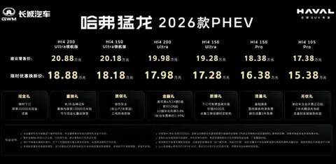 8月19日,新能源方盒子品類開創者,哈弗猛龍2026款正式上市。新車共推出6款車型,限時優惠換新價為15.38萬-18.88萬。同時,新車還推出包括現金禮、置換禮、質保禮在內的7重上市大禮包。