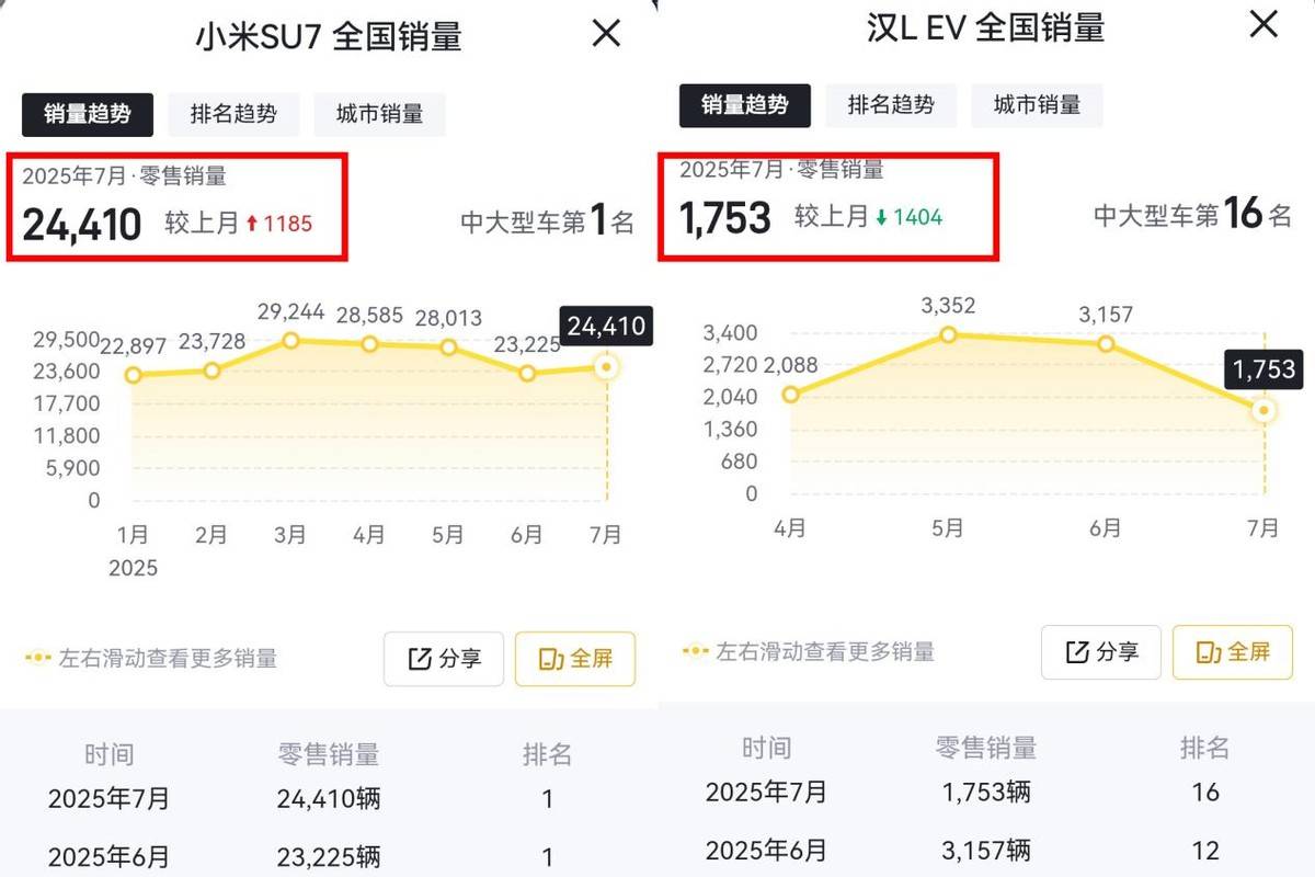 最后,你要問我漢L EV是臺好車嗎?我的回答肯定是。但你要說漢L值得去購買嗎?似乎,在20-30萬這個價位區間里,年輕人可能會更傾向于去購買小米SU7。你要說小米SU7動力比漢L EV強,那真沒有,舒適性比漢L EV好,那也沒有。但事實就是,7月份小米SU7賣了24410輛,而漢L EV卻只賣了1753輛,所以,漢L EV這樣的好車為啥沒火呢?評論區里期待你的答案。