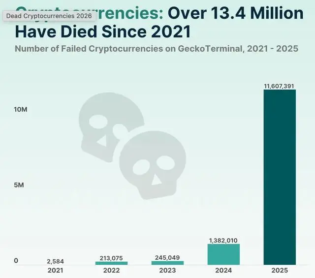 這些“死亡代幣”中,高達(dá)約1160萬個(gè)是在2025年內(nèi)歸零或陷入沉寂,占過去五年全部代幣失敗案例的86.3%。