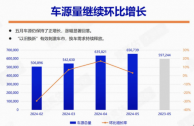 當(dāng)然,眾多新車的推出也導(dǎo)致了5月份的二手車市場車源量環(huán)比上漲有限,依靠著市場回暖和“以舊換新”政策,艱難的維持住了車源量的正增長。預(yù)計6月份,可能會進(jìn)入負(fù)增長的階段。