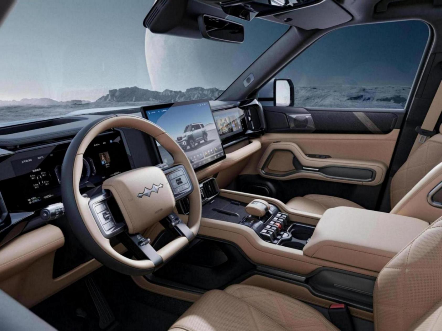 從官圖來看,新車的內飾基本上沿用了方程豹豹5的設計風格,提供有三幅式多功能方向盤、全液晶儀表盤、懸浮式中控屏、副駕駛娛樂屏以及升降式電子檔把,線條感顯得比較硬朗,同時也不乏科技感。